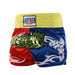 Carry the soul of Thailand's fighting tradition into every round with these ANOTHER BOXER shorts featuring authentic Thai script embroidery. Each pair blends vibrant color combinations with detailed stitchwork that honors the art of eight limbs while keeping you firmly in the present. The glossy satin fabric glides effortlessly as you throw combinations, and the generous side slits give your roundhouses room to breathe. From the striking two-tone elastic waistband to the intricate embroidered designs climbing up each leg, these shorts tell your opponents you came prepared – and you came to win.